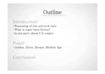 목차 Introduction) -Reasoning of this selected topic -What is super hero fiction? -Learn more about U.S comics Point) -Golden, Silver, Bronze, Modern Age Conclusion) 본문 1.Reason that super hero's were selected Large share in the U.S comics market Global popularity + our difficult situation 2.What is super hero fiction? All the stories that is associated with the super heroes that are relevant to "U.S" 3.Learn more about U.S comics U.S comics system ; Character's copyrights are owed by the company. ; Artists who are belonged to the company can have the right to draw company's characters. Ex) Amazing Spiderman, Friendly Neighborhood Spiderman, Astonishing Spiderman, Spiderman 키워드 미국, 히어로, 변화, 영문 |