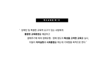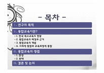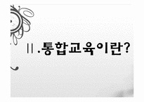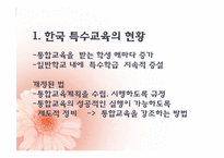 목차 Ⅰ. 연구의 목적 Ⅱ. 통합교육이란? 1. 한국 특수교육의 현황 2. 통합교육의 배경과 근거 3. 통합교육의 개념 4. 사회적 통합과 교육과정적 통합 Ⅲ. 통합교육의 쟁점 1. 찬성 2. 반대 Ⅳ. 결론 및 논의 본문 1. 한국 특수교육의 현황 -통합교육을 받는 학생 해마다 증가 -일반학교 내에 특수학급 지속적 증설 개정된 법 -통합교육계획을 수립, 시행하도록 규정 -통합교육의 성공적인 실행이 가능하도록 제도적 정비 -> 통합교육을 강조하는 방법 2. 통합교육의 배경과 근거 -특수교육 패러다임의 이동과 교육 개혁의 요구 -공동체적 학교 사회의 실현과 졸업 후의 생활에 대비한 교육성과의 요구 -장애인의 삶의 질 향상 요구 Wolfensberger가 말한 정상화는?? 문화적으로 보편적인 방법을 통해 가능한 한 사람들의 행동, 외모, 경험, 지위와 평판을 높이고 지원하여 그들에게 적어도 평균 수준의 시민 생활을 할 수 있도록 하는 것 키워드 통합교육, 찬반, 논의, 통합, 교육, 통합교육의 쟁점 |