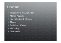 목차 Introduction of Asian Pearl Market Analysis Site Selection & Mission Theme Facilities + Casino Marketing Conclusion 본문 Legalized since 2005 "To remain competitive in the Asian market" Resorts World Sentosa & Marina Bay Sands opened in 2010 Asian Pearl's Competitors Visitor No. & Expenditure 11.6 million visitors in 2010 SG$951 average spend per capital in 2009 16 millon visitors in 2014 SG$1200 average spend per capital Positive Tourist Receipts 49% in tourism receipts in 2010 Gaming Revenue By 29.72% in 2010: US$2.75bn Forecasted: US$8.4bn in 2014 World's second largest gaming hub 키워드 마케팅전략, Pearl, 마케팅, Asian, 영문 |