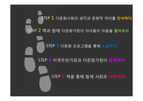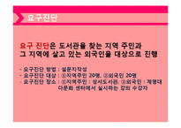목차 1.더불어 도서관 건물 및 공간 배치도 2.환경분석 및 고객분석 3.요구진단 4.목표설정 5.사전 활동 6.월별 독서지도안 7.홍보 활동 8.평가(직원 평가 회의록) 본문 프로그램 필요성 검토 단일민족 → 다문화사회 한국사회와 다문화사회의 생각과 문화적 차이 극복 필요 + 프로그램 환경분석 도서관= 편리한 접근성, 책 대출뿐만 아니라 지역주민을 위한 다양한 평생교육 프로그램 지원 + 목표 집단 분석 다문화 가정의 증가 → 한국사회 부적응, 사회적 편견, 문화적 차이 경제적 어려움 → 다문화 자녀와의 소통시간 부족 → 정체적 확립의 어려움, 내면적 갈등 ↓ 지역주민과 다문화가정이 함께하는 프로그램 키워드 독서지도, 다문화, 독서지, 독서, 교육, 월별 독서지도안 |
