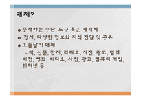 목차 매체? 매체언어? 매체언어교육? 매체언어교육의 목표 3번 문제 텍스트의 의미 변화 문자언어 vs 영상언어 1) 그림책 -> 애니메이션 교육방안 교육내용 수정 효과 2) 만화책 -> 애니메이션 3) 문학 작품 -> 드라마, 영화 효과 4번 문제 1. 여수 엑스포 2. 외국인 범죄 3. 서울 시장 선거 사실과 의견 파악하기 본문 매체? 중재하는 수단, 도구 혹은 매개체 정서, 다양한 정보와 지식 전달 및 공유 오늘날의 매체 - 책, 신문, 잡지, 라디오, 사전, 광고, 텔레비전, 영화, 비디오, 사진, 광고, 컴퓨터 게임, 인터넷 등 매체언어교육? 미디어 리터러시(media literacy) '텍스트의 언어와 기호를 통해 의미를 이해하고 표현할 수 잇는 능력을 기르는 교육' 3번 문제 다음의 사례를 통해 인쇄매체를 영상매체로 변환한 예를 찾아보고, 인쇄매체 텍스트의 의미와 영상매체 텍스트의 의미가 어떤 점에서 같은지, 혹은 어떻게 달라졌는지 설명해 보시오. 그리고 이를 매체 언어 교육에 활용할 수 있는 방안을 구안해 보시오. 키워드 국어교육, 국어, 교육, 매체, 교육방안 |