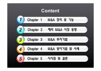 목차 Chapter 1 M&A 정의 및 기능 Chapter 2 해외 M&A 시장 동향 Chapter 3 M&A 투자기법 Chapter 4 M&A 방어기법 및 사례 Chapter 5 시사점 및 결론 본문 △ 순기능 1. 경영효율 향상 2. 소액주주 보호 3. 국가경제적 측면 제고 ▽역기능 1. 경영 외적인 요인에 의한 M&A 기업 선정 2. 경영진의 M&A 대상 회피를 위한 잘못된 지출 경향 3. 매수회사의 대처능력 및 경쟁력 약화 Chapter 2. 해외 M&A 시장 동향 2010년 2007년 금융위기 이후 가장 활황세 신흥시장의 부각으로 전 세계 33.1% VS 2009년 18.8%에서 크게 증가한 수치 국경 간 M&A는 전체 규모의 39.1% VS 2009년 27.6% 대비 큰 폭 증가 수치 사모펀드에 의한 M&A는 2009년 대비 89.2& 증가, 세계 M&A의 9% 수준 2011 EU 재정위기와 미국 경기 불황에 대한 우려로 주식시장 침체 및 변동성 증가로 2010년의 대폭적인 시장 상황 잇지 못함 세계 전체적으로 3사분기 M&A 규모 및 건수는 전년 동기 대비 31%,10& 감소 미국의 경우 주가 침체로 현금 보유 기업들의 경우 M&A보다 자사주 매입 선호&구조조정 방편으로 매각 대신 Spinoff 선택 중국, 인도 등 아시아 시장의 경우는 지속적인 활황세 중 - 방어기법 사례 <칼 아이칸 vs KT&G> 공격 : 칼 아이칸 펀드 국내 담배시장 독점적 지위, 많은 자회사와 부동산 지닌 KT&G 표적 KT&G 2대 주주. "한국인삼공사의 상장과 보유 부동산 매각 등의 요구" 주식 매입 후 공개매각 전환으로 인한 주가 상승으로 칼 아이칸은 한국에서 주식 재처분하여 1500억 원의 이익 키워드 방어기법, 기법, 투자기법, 방어, 해외 |