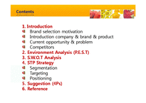 목차 Introduction Brand selection motivation Introduction company & brand & product Current opportunity & problem Competitors 2. Environment Analysis (P.E.S.T) 3. S.W.O.T Analysis 4. STP Strategy Segmentation Targeting Positioning 5. Suggestion (4Ps) 6. Reference 본문 Environment Analysis(PEST analysis) 1) Political Environment - The food safety law for 2012 (1) Consumers can check if the product is to be recalled through smartphones (2) Strengthened standard on hygiene management and nutrition labeling Glaceau multi-v has a painful experience Zinc gluconate was not allowed for normal drinks in 2010 1. Usage of natural coloring agent 2. Enjoy a drink at the time allows the intake of essential nutrients 3. Variety of flavors & colors 4. Unique product design 5. Strong brand awareness for 10-20 6. Competitive size against competitors 7. Characterful Storytelling-based marketing 1.Relatively expensive price than competitors 2. Flat and watery taste 3. Somewhat higher calories 4. Lower customer affinity than high awareness 5.Not popular to general public 6. Inconvenience for portability as its size 참고문헌 1.http//styem.mtco.kr/styview.php?no=2012020809495790832&type=1 2. http//www.haakyung.com/news/app/newsview.php?aid=201202089859g 3. http//www.mt.co.kr/view/mtview.php?type=1&no=2011092614187032873&outlink=1 4. http//blog.naver.com/cnm_univ? Redirect=Log&logNo=140146415731 5. http//trendinsight. Biz/archives/42181 6. http//news.mk.co.kr/newRead.php?year =2009&no=484766 7. http//www.newstomato.com/ReadNews.aspx?no=147129 8. http//news.mk.co.kr/newsRead.php?year=2010&no=623190 키워드 Vitamin, 마케팅, 비타민, 워터, Water |