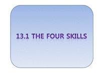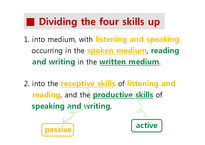 목차 13.1 THE FOUR SKILLS 13.2 COMPREHENSION 13.3 FACILITATING COMPREHENSION 13.4 WRITING 본문 ■ Dividing the four skills up 1. into medium, with listening and speaking occurring in the spoken medium, reading and writing in the written medium. 2. into the receptive skills of listening and reading, and the productive skills of speaking and writing. In some approaches to language teaching, the four skills are treated separately. There are obvious advantages to doing this. But, it is important to realize that there are similarities and interconnections between the skills as well. 키워드 Chapter, skills |