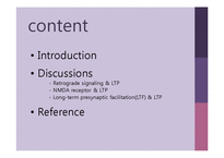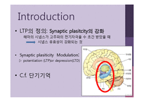 목차 Introduction Discussions - Retrograde signaling & LTP - NMDA receptor & LTP - Long-term presynaptic facilitation(LTF) & LTP Reference 본문 Introduction LTP의 정의: Synaptic plasitcity의 강화 → 해마의 시냅스가 고주파의 전기자극을 수 초간 받았을 때 시냅스 유효성이 강화되는 것 Synaptic plasiticity Modulation: ▷ potentiation (LTP)or depression(LTD) C.f. 단기기억 LTP의 History - 스페인 neuroanatomist "Santiago Ramón y Cajal" ▷ learning & memory가 뉴런들의 connection 강화에 기인 함을 처음으로 제시 - Hebbian theory (by Donald Hebb): ▷ "Santiago Ramón y Cajal"의 이론 재조명 - 노르웨이 neurophysiologist "Terje Lømo" ▷ LTP를 처음으로 발견 ▶ 토끼의 hippocampus를 이용 참고문헌 Ype Elgersma and Alcino J Silva, 1999, Molecular mechanisms of synaptic plasticity and memory, Current Opinion in Neurobiology 9:209-213 강봉균, 2001, 기억과 시냅스 가소성, 한국뇌학회지 vol. 1, No. 1, pp.1 3-24 Dee Unglaub Silverthorn, 2010, HUMAN PHYSIOLOGY, PEARSON, 281, 286-287 Huizhong et al / Retrograde signaling at central synapses / University of California / 2001 / 1,3,5W 키워드 장기기억, Term, Long, 생리학, Potentiation |