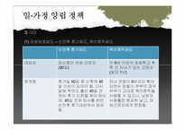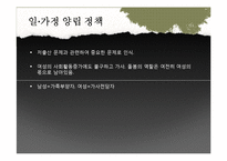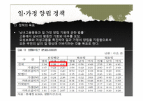 목차 01일가정양립정책 젠더관점에서 본 선택분석 02결혼이주여성정책 과정분석 03결론 및 과제 본문 일.가정 양립 정책 저출산 문제과 관련하여 중요한 문제로 인식. 여성의 사회활동증가에도 불구하고 가사, 돌봄의 역할은 여전히 여성의 몫으로 남아있음. 남성=가족부양자, 여성=가사전담자 2) 대상 (2) 보육서비스 1991년 영유아보육법 제정당시 보육대상 '보호자가 근로 또는 질병기타 사정으로 인하여 보호하기 어려운 영아 및 유아' → 잔여적개념 2004년 영유아보육법 개정 저소득층 차등보육료 2005년 두자녀 보육료지원 2008년 장애아 지원이 포함 수혜대상은 모든 아동이 아니라 보육시설을 이용하는 아동, 자산조사에 따른 지원으로 선별적인 방식을 취함. 키워드 사회복지, 복지, 가족, 정책, 연구, 일가정양립정책 |