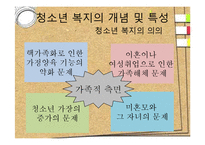 목차 1.청소년 복지의 개념 및 특성 청소년 복지의 개념 청소년 복지의 의의 청소년 복지의 특성 2.청소년 복지의 발달 과정 청소년복지의 발달 청소년 복지의 발달 과정 3.청소년 복지의 필요성과 내용 청소년 복지의 필요성 청소년 복지의 내용 본문 청소년 복지의 개념 및 특성 청소년 복지의 개념 독립된 사회복지 분야 중 하나로 보호청소년 특정 집단에 국한되는 것이 모든 청소년의 기본적 욕구의 충족과 건강한 성장, 발달의 촉진, 청소년이 사회구성원으로서 주체적인 삶을 영위하도록 하고, 더 나아가 청소년을 둘러싼 환경이 청소년의 성장을 돕기 위해 최적의 기능을 발휘 할 수 있도록 청소년과 가정, 사회를 통해 직.간접적으로 제공되는 모든 사회정책과 관련제도 및 전문적 활동 핵가족화로 인한 가정양육 기능의 약화 문제 이혼이나 여성취업으로 인한 가족해체 문제 청소년 가장의 증가의 문제 미혼모와 그 자녀의 문제 가족적 측면 키워드 발달과정, 사회복지, 복지, 청소년, 발달 |