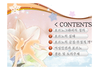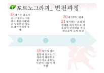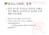 목차 1.포르노그라피의 정의 2.포르노의 실태 3.포르노의 긍정 부정적 영향 4.여성인권과 포르노 5.결론 및 토의주제 본문 포르노그라피_정의 성적 자극을 목적으로 인간의 신체나 성적 행동을 사실적으로 묘사한 문학 영화 사진 회화 줄여서 포르노라고 부르기도 함 어원 그리스어 '포르노그라포스(pornographos)' = '창녀(porn )에 관하여 쓰여진 것(graphos)' 포르노그라피_ 변천과정 18세기는 과도기로서 '포르노그라피의 황금시대'라고 일컬어질 정도로 쾌락주의가 유행 19세기에 접어들면서 포르노그라피가 대량으로 쏟아지고 포르노 사진이 나돌기 시작함 20세기부터 현재 21세기에는 '표리'의 경계를 의식적으로 사용하여 상상력을 자극함으로써 소비 촉진 키워드 성심리학, 포르노, 인식, 연구 |