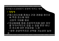 목차 디지털 스토리 텔링의 정의 디지털 스토리 텔링이 관광에 미치는 영향 관광객의 입장에서 디지털 스토리텔링의 효과 사례 -영화, 드라마, 애니메이션 / 부천 디지털 관광 스토리텔링의 한계 및 발전 방향 본문 디지털스토리텔링이 관광에 미치는 영향 관광객 매스미디어를 통해서 간접 경험을 함으로써 특정 장소에 대한 긍정적 기대를 형성 영상매체를 통해 관광목적지에 대한 정보를 무의식적으로 얻을 수 있을 뿐만 아니라 장소에 대한 친밀감을 느낌 ☞향후 관광목적지로 선택할 가능성이 높아짐 관광사업자 영화 촬영지 이미지의 노출시간이 길어 장기적이고 반복적으로 촬영지 선전 영화배우나 특수효과, 다양한 카메라 포착을 통해 영화촬영지의 이미지 부각 특별한 경비 지출 없이 새로운 장소를 개발ㆍ홍보하고 잠재관광객을 유인 제작사 경비 절감과 각종 편의 제공 등 이익 키워드 디지털, 스토리텔링, 영향, 관광 |