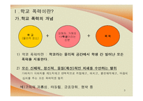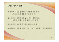 목차 Ⅰ. 학교 폭력이란? 가. 개념 나. 종류 다. 현재 학교 폭력의 실태 라. 특징 마. 사례 바. 원인 사. 문제점 Ⅱ. 본 론 가. 학교 폭력 법 / 정책 문제점 나. 학교 폭력 관련 기관 및 상담센터 청소년 폭력 예방 재단-상담 프로그램 소개 및 치료 프로그램 문제점 다. 외국의 예방교육 프로그램 문제점 Ⅲ. 결 론 본문 Ⅰ.학교 폭력이란? 가.학교 폭력의 개념 가.학교 폭력의 개념 + 피해자, 가해자 =>학생이라는 신분 + 폭력 1) 학교 폭력이란 : 학교라는 물리적 공간에서 학생 간 일어난 모든 폭력을 지칭한다. 2) 모든 신체적, 정신적, 물질(재산)적인 피해를 수반하는 행위 가해자가 피해자를 의도적이고 반복적으로 위협하고, 해치고, 불편하게하고, 마음에 상처를 주는 모든 폭력적인 행위 예)고의적 괴롭힘, 따돌림, 금품갈취, 협박 등 키워드 비행문제, 학교폭력, 해결방안, 청소년, 폭력 |