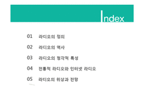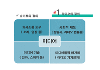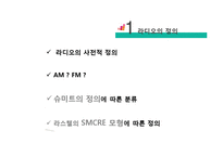 목차 01 라디오의 정의 02 라디오의 역사 03 라디오의 청각적 특성 04 전통적 라디오와 인터넷 라디오 05 라디오의 위상과 전망 본문 1.라디오의 정의 라디오의 사전적 정의 AM ? FM ? 슈미트의 정의에 따른 분류 라스웰의 SMCRE 모형에 따른 정의 슈미트의 정의 의사소통 도구( 소리, 영상 등) 사회적 제도( 방송사, 라디오 법률등) 미디어 기술( 전파, 스피커 등) 미디어물적 매개체( 라디오 기계장치) 하지만 남아있는 청각매체의 자존심이 있었으니 그것은 바로 키워드 라디오, 미디어문화, 인터넷, 미디어, 비교 |