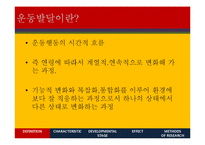 목차 정의 특징 발달 단계 영향 연구방법 본문 운동 발달이란? 운동행동의 시간적 흐름 즉 연령에 따라서 계열적.연속적으로 변화해 가는 과정. 기능적 변화와 복잡화,통합화를 이루어 환경에 보다 잘 적응하는 과정으로서 하나의 상태에서 다른 상태로 변화하는 과정 운동 발달의 단계 성장과 세련단계 : 청소년기에 호르몬분비의 증가로 인해 체격이 커지며 운동능력이 현저하게 발달되는 단계 최고수행단계 : 20-30세에 이르면 그동안 꾸준하게 발달되어 온근력과 심폐기능,정보처리 능력이 최고조가 되어 최상의 운동 수행력을 보이는 단계 퇴보단계 : 30세가 지나면 전체적인 운동능력이 저하되기 시작하는 단계(개인차가 있지만 대부분 남자보다 여자가 먼저 저하됨) 키워드 운동발달, 발달, 영향, 운동, 연구 |